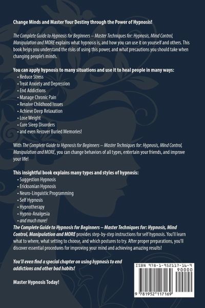 Change Minds and Master Your Destiny through the Power of Hypnosis! Hypnosis: The Complete Guide to Hypnosis for Beginners – Master Techniques for: Hypnosis, Mind Control, Manipulation and MORE explains what hypnosis is, and how you can use it on yourself and others. This book helps you understand the risks of using this power, and what precautions you should take when changing people’s minds. You can apply hypnosis to many situations and use it to heal people in many ways: Reduce Stress Treat Anxiety and Depression End Addictions Manage Chronic Pain Resolve Childhood Issues Achieve Deep Relaxation Cure Sleep Disorders and even Recover Buried Memories! With Hypnosis: The Complete Guide to Hypnosis for Beginners – Master Techniques for: Hypnosis, Mind Control, Manipulation and MORE you can change behaviors of all types, entertain your friends, and improve your life! This insightful book explains many types and styles of hypnosis: Suggestion Hypnosis Ericksonian Hypnosis Neuro-Linguistic Programming Self Hypnosis Hypnotherapy Hypno-Analgesia and much more! Hypnosis: The Complete Guide to Hypnosis for Beginners – Master Techniques for: Hypnosis, Mind Control, Manipulation and MORE provides step-by-step instructions for self hypnosis. You’ll learn what to where, what setting to choose, and which postures to try. After proper preparations, you’ll discover essential procedures for improving your mind and achieving amazing results! You’ll even find a special chapter on using hypnosis to end addictions and other bad habits! Order Your Copy Today! You’ll be so happy you did!