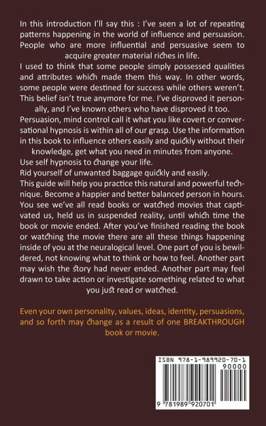 In this introduction I'll say this : I've seen a lot of repeating patterns happening in the world of influence and persuasion. People who are more influential and persuasive seem to acquire greater material riches in life. I used to think that some people simply possessed qualities and attributes which made them this way. In other words, some people were destined for success while others weren't. This belief isn't true anymore for me. I've disproved it personally, and I've known others who have disproved it too. Persuasion, mind control call it what you like covert or conversational hypnosis is within all of our grasp. Use the information in this book to influence others easily and quickly without their knowledge, get what you need in minutes from anyone. Use self hypnosis to change your life. Rid yourself of unwanted baggage quickly and easily. This guide will help you practice this natural and powerful technique. Become a happier and better balanced person in hours. You see we've all read books or watched movies that captivated us, held us in suspended reality, until which time the book or movie ended. After you've finished reading the book or watching the movie there are all these things happening inside of you at the neuralogical level. One part of you is bewildered, not knowing what to think or how to feel. Another part may wish the story had never ended. Another part may feel drawn to take action or investigate something related to what you just read or watched. Even your own personality, values, ideas, identity, persuasions, and so forth may change as a result of one BREAKTHROUGH book or movie.
