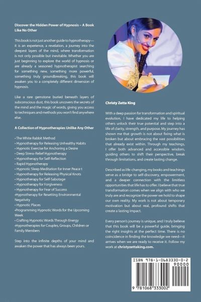 Discover the Hidden Power of Hypnosis - A Book Like No Other This book is not just another guide to hypnotherapy-it is an experience, a revelation, a journey into the deepest layers of the mind, where transformation is not only possible but inevitable. Whether you are just beginning to explore the world of hypnosis or are already a seasoned hypnotherapist searching for something new, something more powerful, something truly groundbreaking, this book will awaken you to a completely different dimension of hypnosis. Like a rare gemstone buried beneath layers of subconscious dust, this book uncovers the secrets of the mind and the magic of words, giving you access to techniques and methods you won't find anywhere else. A Collection of Hypnotherapies Unlike Any Other ¿ The White Rabbit Method ¿ Hypnotherapy for Releasing Unhealthy Habits ¿ Hypnotic Exercise for Anchoring a Desire ¿ Deep Stress-Relief Hypnotherapy ¿ Hypnotherapy for Self-Reflection ¿ Rapid Hypnotherapy ¿ Hypnotic Sleep Meditation for Inner Peace t ¿ Hypnotherapy for Releasing Physical Knots ¿ Hypnotherapy for Self-Sabotage ¿ Hypnotherapy for Forgiveness ¿ Hypnotherapy for Fear of Success ¿ Hypnotherapy for Resetting Environmental Negativity ¿ Hypnotic Places ¿ Programming Hypnotic Words for the Upcoming Week ¿ Crafting Hypnotic Words Through Energy ¿ Hypnotherapies for Couples, Groups, Children or Family Members Step into the infinite depths of your mind and awaken the power that has always been yours.