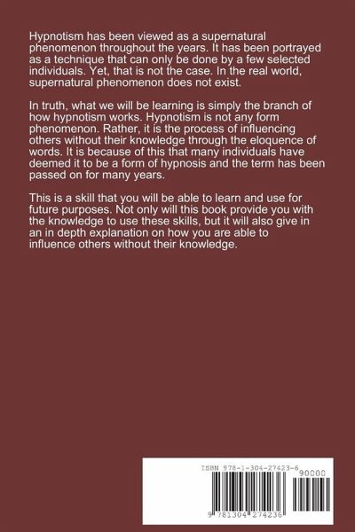 Hypnotism has been viewed as a supernatural phenomenon throughout the years. It has been portrayed as a technique that can only be done by a few selected individuals. Yet, that is not the case. In the real world, supernatural phenomenon does not exist. In truth, what we will be learning is simply the branch of how hypnotism works. Hypnotism is not any form phenomenon. Rather, it is the process of influencing others without their knowledge through the eloquence of words. It is because of this that many individuals have deemed it to be a form of hypnosis and the term has been passed on for many years. This is a skill that you will be able to learn and use for future purposes. Not only will this book provide you with the knowledge to use these skills, but it will also give in an in depth explanation on how you are able to influence others without their knowledge.