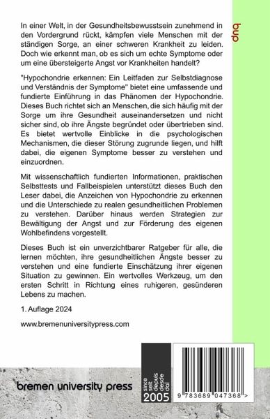 In einer Welt, in der Gesundheitsbewusstsein zunehmend in den Vordergrund rückt, kämpfen viele Menschen mit der ständigen Sorge, an einer schweren Krankheit zu leiden. Doch wie erkennt man, ob es sich um echte Symptome oder um eine übersteigerte Angst vor Krankheiten handelt? "Hypochondrie erkennen: Ein Leitfaden zur Selbstdiagnose und Verständnis der Symptome" bietet eine umfassende und fundierte Einführung in das Phänomen der Hypochondrie. Dieses Buch richtet sich an Menschen, die sich häufig mit der Sorge um ihre Gesundheit auseinandersetzen und nicht sicher sind, ob ihre Ängste begründet oder übertrieben sind. Es bietet wertvolle Einblicke in die psychologischen Mechanismen, die dieser Störung zugrunde liegen, und hilft dabei, die eigenen Symptome besser zu verstehen und einzuordnen. Mit wissenschaftlich fundierten Informationen, praktischen Selbsttests und Fallbeispielen unterstützt dieses Buch den Leser dabei, die Anzeichen von Hypochondrie zu erkennen und die Unterschiede zu realen gesundheitlichen Problemen zu verstehen. Darüber hinaus werden Strategien zur Bewältigung der Angst und zur Förderung des eigenen Wohlbefindens vorgestellt. Dieses Buch ist ein unverzichtbarer Ratgeber für alle, die lernen möchten, ihre gesundheitlichen Ängste besser zu verstehen und eine fundierte Einschätzung ihrer eigenen Situation zu gewinnen. Ein wertvolles Werkzeug, um den ersten Schritt in Richtung eines ruhigeren, gesünderen Lebens zu machen.