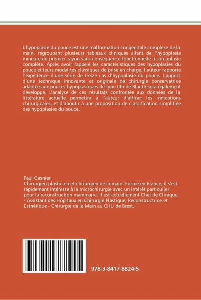 L'hypoplasie du pouce est une malformation congénitale complexe de la main, regroupant plusieurs tableaux cliniques allant de l'hypoplasie mineure du premier rayon sans conséquence fonctionnelle à son aplasie complète. Après avoir rappelé les caractéristiques des hypoplasies du pouce et leurs modalités classiques de prise en charge, l'auteur rapporte l'expérience d'une série de treize cas d'hypoplasie du pouce. L'apport d'une technique innovante et originale de chirurgie conservatrice adaptée aux pouces hypoplasiques de type IIIb de Blauth sera également développé. L'analyse de ces résultats confrontée aux données de la littérature actuelle permettra à l'auteur d'affiner les indications chirurgicales, et d'aboutir à une proposition de classification simplifiée des hypoplasies du pouce.