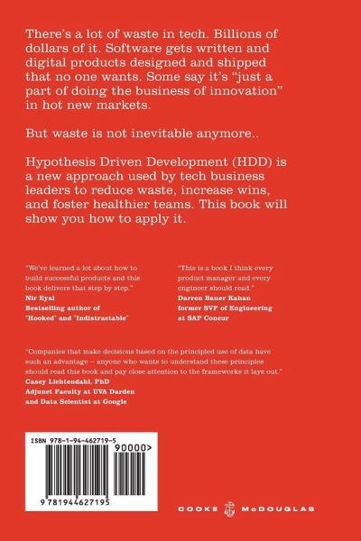 There's a lot of waste in tech. Billions of dollars of it. Software gets written and digital products designed and shipped that no one wants. Some say it's "just a part of doing the business of innovation" in hot new markets. But waste is not inevitable anymore. Hypothesis-Driven Development (HDD) is an emerging approach to digital product management for both business people and engineers. It emphasizes rigorous, continuous experimentation as a way to both minimize waste and focus teams' creative capabilities in directions that drive growth and innovation. In this book, Alex Cowan delivers a fresh new formula that helps teams reliably derive measurable value for a product or feature. Rather than focusing on mere output, successful tech leaders (and companies) are using HDD to build smarter. Drive a culture of continuous experimentation and continuous delivery, and create the outcomes you want with HDD. Using a modern, evidence-based approach and a focus on the economics of decisions, Cowan guides today's business leaders towards creative confidence and fluency across the product development process. Work with your development team to deliver code securely, confidently, and with value-adds. Use modern, cutting edge practices to drive growth, minimize waste, and innovate. You can deliver business value and create great digital products. This book will show you how.