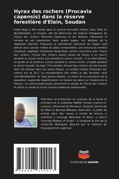 Cette étude a été menée dans la réserve forestière d'Elain, dans l'État du Nord-Kordofan, au Soudan, afin de déterminer les aspects biologiques de l'hyrax des rochers (Procavia Capensis) et les facteurs influençant le nombre de ses populations dans quatre kopjes. Les attributs de la végétation (densité, fréquence et abondance) entourant les kopjes sont utilisés pour calculer l'indice de valeur d'importance, une mesure du nombre d'espèces végétales facilement disponibles comme nourriture pour l'hyrax des rochers. L'hyrax des rochers passe autant de temps à se nourrir pendant la saison sèche que pendant la saison humide ; il se tient debout, se gratte et se prélasse surtout pendant la saison sèche, et baille pendant la saison humide. Au total, 770 individus d'hyrax des rochers ont été trouvés dans 30 colonies dans les quatre Kopjes. Le nombre moyen d'individus par colonie est de 25,7. La morphométrie des mâles et des femelles varie considérablement. Le ratio jeunes-adultes, un indice de la croissance de la population, augmente régulièrement. La menace qui pèse sur l'espèce est la chasse ; la communauté locale consomme la viande de l'hyrax des rochers et utilise la viande et l'urine comme médecine traditionnelle.