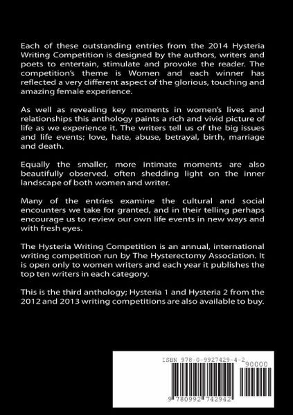 Hysteria 3 is an anthology of winning stories, flash fiction and poetry from the 2014 Hysteria Writing Competition. Each contribution is designed by the authors, writers and poets to entertain, stimulate and provoke the reader. The competition's theme is Women and each winner has reflected a very different aspect of the glorious, touching and amazing female experience. As well as revealing key moments in women's lives and relationships this anthology paints a rich and vivid picture of life as we experience it. The writers tell us of the big issues and life events; love, hate, abuse, betrayal, birth, marriage and death. Equally, the smaller, more intimate moments are also beautifully observed, often shedding light on the inner landscape of both women and writer. Many of the entries examine the cultural and social encounters we take for granted, and in their telling perhaps encourage us to review our own life events in new ways and with fresh eyes.