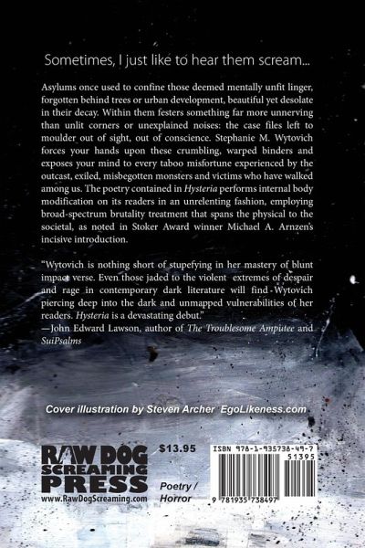 Asylums once used to confine those deemed mentally unfit linger, forgotten behind trees or urban development, beautiful yet desolate in their decay. Within them festers something far more unnerving than unlit corners or unexplained noises: the case files left to moulder out of sight, out of conscience. Stephanie M. Wytovich forces your hands upon these crumbling, warped binders and exposes your mind to every taboo misfortune experienced by the outcast, exiled, misbegotten monsters and victims who have walked among us. The poetry contained in Hysteria performs internal body modification on its readers in unrelenting fashion, employing broad-spectrum brutality treatment that spans the physical to the societal, as noted in Stoker Award winner Michael A. Arnzen's incisive introduction.