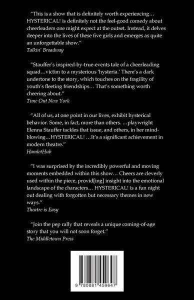 "This is a show that is definitely worth experiencing... HYSTERICAL! is definitely not the feel-good comedy about cheerleaders one might expect at the outset. Instead, it delves deeper into the lives of these five girls and emerges as quite an unforgettable show." Talkin' Broadway "Stauffer's inspired-by-true-events tale of a cheerleading squad...victim to a mysterious 'hysteria.' There's a dark undertone to the story, which touches on the fragility of youth's fleeting friendships... That's something worth cheering about." Time Out New York "All of us, at one point in our lives, exhibit hysterical behavior. Some, in fact, more than others. ...playwright Elenna Stauffer tackles that issue, and others, in her mind-blowing...HYSTERICAL! ...It's a significant achievement in modern theatre." HamletHub "I was surprised by the incredibly powerful and moving moments embedded within this show... Cheers are cleverly used within the piece, provid[ing] insight into the emotional landscape of the characters... HYSTERICAL! is a fun night out dealing with forgotten but necessary themes in new ways." Theatre is Easy "Join the pep rally that reveals a unique coming-of-age story that you will not soon forget." The Middletown Press