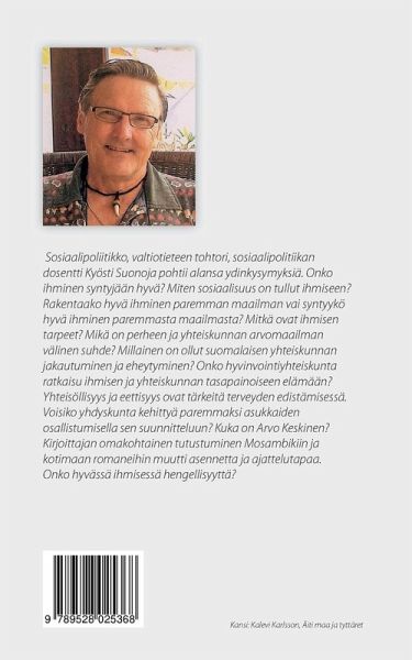 Kehittääkö hyvä ihminen paremman maailman vai onko ensin rakennettava parempi maailma, joka synnyttäisi hyvän ihmisen? Tästä teemasta löytyy pohdintoja. Kirja kertoo ihmislajin kehityksestä, perimästä ja solidaarisuudesta. Ihmisen perus- ja muista tarpeista esitellään sosiaalipoliittisia näkökulmia. Kansakunnan perusvastakohtaisuudet muuttuvat aikojen kuluessa. Suomalaisen yhteiskunnan jakautuminen ja yhdistyminen on vuosikymmeniä kestänyt ajanjakso. Hyvinvointivaltion syntyyn liittyi yhteiskunnallinen kritiikki. Pekka Kuusen askelmerkit loivat tavoitteen sosiaalipolitiikan kehittämiselle. Siirryttiin hyvinvointivaltiosta hyvinvointiyhteiskuntaan ja siitä kansalaisyhteiskuntaan. Hyvinvoinnin arvot muuttivat naisen aseman perheessä ja yhteiskunnassa. Yhteisöllisyys ja eettisyys nousivat esille kansanterveyden edistämisessä. Yhdyskuntasuunnittelussa uusi elementti oli asukkaiden osallistuminen alueensa suunnitteluun. Työläisperheen viitetyypin Arvo Keskisen perheen elämää seurataan vuosisadan alusta lähtien. Suomalaisten suhtautuminen kansallisiin vähemmistöihin sekä kaukana oleviin kehitysmaiden ihmisiin tulee kirjassa esille. Kirjoittaja on toiminut valtiovallan edustajana romaniasiain neuvottelukunnassa sekä kaksi vuotta kehityskumppanina Mosambikin sosiaaliministeriösssä.