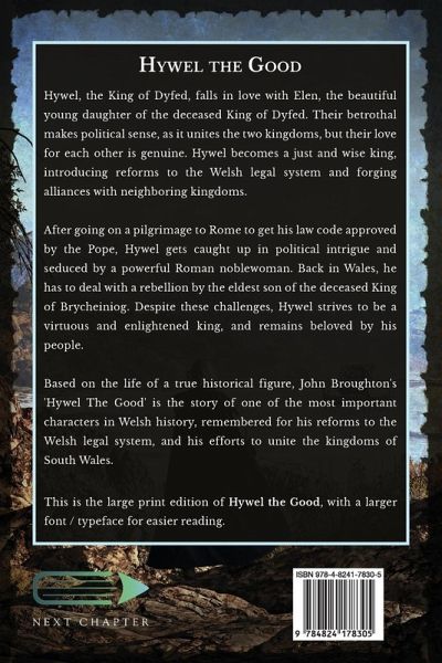 Hywel, the King of Dyfed, falls in love with Elen, the beautiful young daughter of the deceased King of Dyfed. Their betrothal makes political sense, as it unites the two kingdoms, but their love for each other is genuine. Hywel becomes a just and wise king, introducing reforms to the Welsh legal system and forging alliances with neighboring kingdoms. After going on a pilgrimage to Rome to get his law code approved by the Pope, Hywel gets caught up in political intrigue and seduced by a powerful Roman noblewoman. Back in Wales, he has to deal with a rebellion by the eldest son of the deceased King of Brycheiniog. Despite these challenges, Hywel strives to be a virtuous and enlightened king, and remains beloved by his people. Based on the life of a true historical figure, John Broughton's 'Hywel The Good' is the story of one of the most important characters in Welsh history, remembered for his reforms to the Welsh legal system, and his efforts to unite the kingdoms of South Wales. This is the large print edition of Hywel the Good, with a larger font / typeface for easier reading.