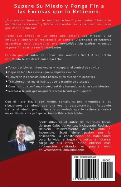 Supere Su Miedo y Ponga Fin a las Excusas que lo Retienen. ¿Sus miedos internos le impiden actuar? ¿Los malos hábitos lo mantienen atascado? ¿Quiere reinventar su vida pero no sabe por dónde empezar? Házlo con Miedo es un libro que desafía sus miedos y lo empuja a superar la resistencia al cambio. Aprenderá estrategias específicas para desarrollar una mentalidad sin límites mientras le pone fin a las creencias limitantes. Scott Allan es el autor de múltiples libros de gran éxito de ventas, incluyendo Rechazo Reinicio, Relanzamiento de Su Vida e Invencible. Scott tiene pasión por la enseñanza, la construcción de habilidades para la vida, e inspira a otros a hacerse cargo de sus vidas. Escrito por el autor de libros más vendidos Scott Allan, Házlo con Miedo le mostrará cómo hacerlo: * Tomar decisiones intencionales y recuperar el control de su vida * Dejar de lado las excusas que le impiden avanzar * Convertir los pensamientos negativos en elecciones positivas * Transformar los malos hábitos que lo mantienen atascado * Construir una confianza inquebrantable tomando acciones consistentes * Rechazar la vida que no quiere y crear la vida que sí quiere Con el libro Házlo con Miedo, construirá una inmunidad a las situaciones de miedo que una vez lo desconcertaron. Actuando frente al miedo, pondrá fin a la auto-duda que lo retiene y creará un estilo de vida próspero, invencible e intrépido.