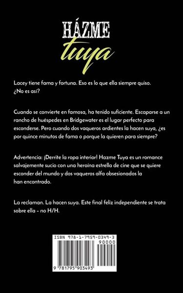 Lacey tiene fama y fortuna. Eso es lo que ella siempre quiso. ¿No es así? Cuando se convierte en famosa, ha tenido suficiente. Escaparse a un rancho de huéspedes en Bridgewater es el lugar perfecto para esconderse. Pero cuando dos vaqueros ardientes la hacen suya, ¿es por quince minutos de fama o porque la quieren para siempre? Advertencia: ¡Derrite la ropa interior! Hazme Tuya es un romance salvajemente sucio con una heroína estrella de cine que se quiere esconder del mundo y dos vaqueros alfa obsesionados la han encontrado. La reclaman. La hacen suya. Este final feliz independiente se trata sobre ella – no H/H.