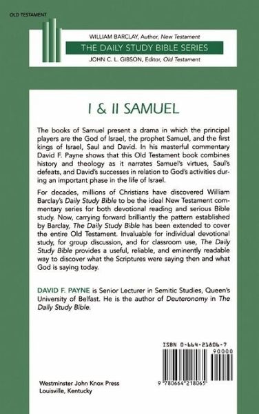The books of Samuel present a drama in which the principal players are the God of Israel, the prophet Samuel, and the first kings of Israel, Saul and David. In his masterful commentary David F. Payne shows that this Old Testament book combines history and theology as it narrates Samuel's virtues, Saul's defeats, and David's successes in relation to God's activities during an important phase in the life of Israel. Carrying forward brilliantly the pattern established by Barclay's New Testament series, The Daily Study Bible has been extended to cover the entire Old Testament as well. Invaluable for individual devotional study, for group discussion, and for classroom use, The Daily Study Bible provides a useful, reliable, and eminently readable way to discover what the Scriptures were saying then and what God is saying today.