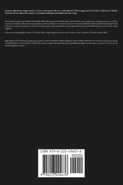 In questo affascinante viaggio storico, ti invito a immergerti nelle vite e nell'eredità dei 50 Personaggi Storici che hanno Trasformato il Mondo. Preparati ad essere affascinato, ispirato e meravigliato dalle figure più influenti di tutti i tempi. Dai visionari rivoluzionari ai leader instancabili, dalle brillanti menti scientifiche agli artisti innovativi, questa collezione ti condurrà attraverso i secoli e i continenti, svelando le affascinanti storie di coloro che hanno sfidato le convenzioni e lasciato un'impronta indelebile nella storia dell'umanità. Esplorando le loro vite, scoprirai le passioni e i sacrifici che li hanno spinti avanti, superando avversità apparentemente insormontabili nella loro ricerca di un mondo migliore. I loro successi trascendono il tempo e le culture, abbracciando campi così diversi come la scienza, l'arte, la politica, la filosofia e molto altro. Ogni pagina ti farà testimone di come questi uomini e donne straordinari abbiano sfidato le norme stabilite, affrontato le avversità e scatenato una cascata di trasformazioni nei loro rispettivi campi. Il loro lascito ci ispira tutti a guardare oltre il possibile, perseguire i nostri sogni con passione e lottare per un mondo più giusto ed equo.