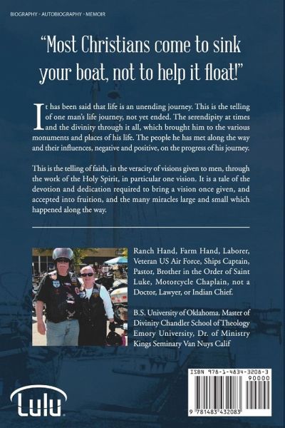 "Most Christians come to sink your boat, not to help it float!" It has been said that life is an unending journey. This is the telling of one man's life journey, not yet ended. The serendipity at times and the divinity through it all, which brought him to the various monuments and places of his life. The people he has met along the way and their influences, negative and positive, on the progress of his journey. This is the telling of faith, in the veracity of visions given to men, through the work of the Holy Spirit, in particular one vision. It is a tale of the devotion and dedication required to bring a vision once given, and accepted into fruition, and the many miracles large and small which happened along the way.