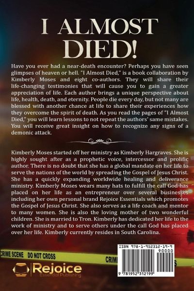 Have you ever had a near-death encounter? Perhaps you have seen glimpses of heaven or hell. "I Almost Died," is a book collaboration by Kimberly Moses and eight co-authors. They will share their life-changing testimonies that will cause you to gain a greater appreciation of life. Each author brings a unique perspective about life, health, death, and eternity. People die every day, but not many are blessed with another chance at life to share their experiences how they overcome the spirit of death. As you read the pages of "I Almost Died," you will learn lessons to not repeat the authors' same mistakes. You will receive great insight on how to recognize any signs of a demonic attack.
