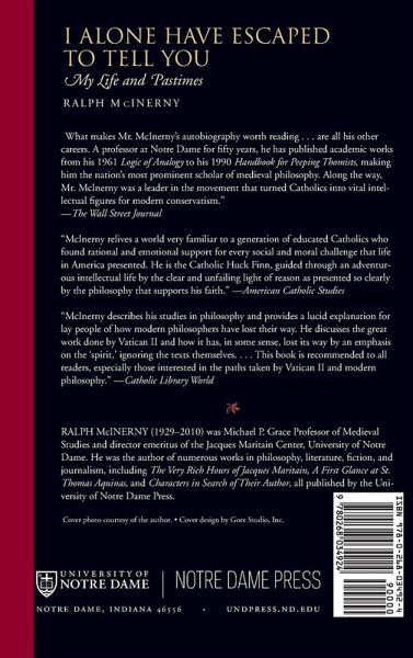 With I Alone Have Escaped to Tell You, Ralph McInerny-distinguished scholar, mystery writer, editor, publisher, and family man-delivers a thoroughly engaging memoir. In the course of his recollections, McInerny describes his childhood in Minnesota; his grammar school and seminary education, with his decision to leave the path toward ordination; his marriage to his beloved Connie and their active family life and travels; and his life as a fiction writer. We learn of his career as a Catholic professor of philosophy at Notre Dame, his views on the Catholic Church, his experiences as an editor and publisher of Catholic magazines and reviews, his involvement with the International Catholic University, and his thoughts on other Catholic writers. Part homage to his academic home for the last half century and part appreciation of the many significant friendships he has fostered over his life, McInerny's reminiscences beautifully convey his lively interest in the world and his gift for friendship and collegiality. Written in his characteristically elegant style, by turns charming, poignant, humorous, and revealing, I Alone Have Escaped to Tell You will delight McInerny's many devoted readers.