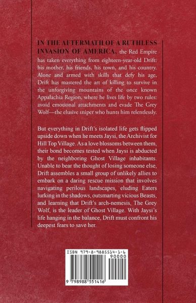 IN THE AFTERMATH OF A RUTHLESS INVASION OF AMERICA, the Red Empire has taken everything from eighteen-year-old Drift: his mother, his friends, his town, and his country. Alone and armed with skills that defy his age, Drift has mastered the art of killing to survive in the unforgiving mountains of the once-known Appalachia Region, where he lives life by two rules: avoid emotional attachments and evade The Grey Wolf-the elusive sniper who hunts him relentlessly. But everything in Drift's isolated life gets flipped upside down when he meets Jaysi, the Archivist for Hill Top Village. As a love blossoms between them, their bond becomes tested when the neighboring Ghost Village inhabitants abduct Jaysi. Unable to bear the thought of losing someone else, Drift assembles a small group of unlikely allies to embark on a daring rescue mission that involves navigating perilous landscapes, eluding Eaters lurking in the shadows, outsmarting vicious Beasts, and learning that Drift's arch-nemesis, The Grey Wolf, is the leader of Ghost Village. With Jaysi's life hanging in the balance, Drift must confront his deepest fears to save her.