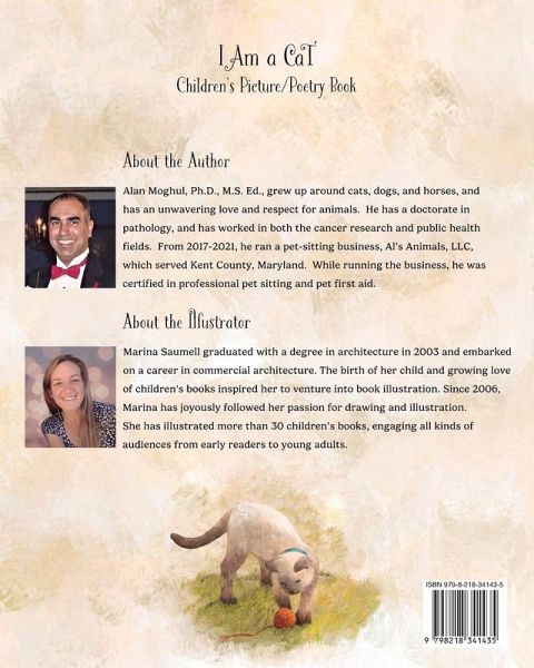 I Am a Cat is a children's picture book that's told from the point of view of a household cat. Designed to educate young children about cat behavior and care, the picture book is written in the form of several simple-to-read poem puzzles. Each puzzle asks the reader a question. Answers and additional information are provided at the end.