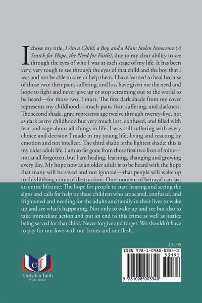 I chose my title, I Am a Child, a Boy, and a Man: Stolen Innocence (A Search for Hope, the Need for Faith), due to my clear ability to see through the eyes of who I was at each stage of my life. It has been very, very tough to see through the eyes of that child and the boy that I was and not be able to save or help them. I have learned to heal because of those two; their pain, suffering, and loss have given me the need and hope to fight and never give up or stop screaming out to the world to be heard-for those two, I must. The first dark shade from my cover represents my childhood-much pain, fear, suffering, and darkness. The second shade, gray, represents age twelve through twenty-five, not as dark as my childhood but very much lost, confused, and filled with fear and rage about all things in life. I was still suffering with every choice and decision I made in my young life, living and reacting by emotion and not intellect. The third shade is the lightest shade; this is my older adult life. I am so far gone from those first two lives of mine-not at all forgotten, but I am healing, learning, changing and growing every day. My hope now as an older adult is to be heard with the hope that many will be saved and not ignored-that people will wake up to this lifelong crime of destruction. One moment of betrayal can last an entire lifetime. The hope for people to start hearing and seeing the signs and calls for help by these children who are scared, confused, and frightened and needing for the adults and family in their lives to wake up and see what's happening. Not only to wake up and see but also to take immediate action and put an end to this crime as well as justice being served for that child. Never forgive and forget. We shouldn't have to pay for our love with our bones and our flesh.