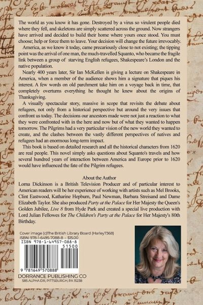The world as you know it has gone. Destroyed by a virus so virulent people died where they fell, and skeletons are simply scattered across the ground. Now strangers have arrived and decided to build their home where yours once stood. You must choose; help or force them to leave. Your decision will change the future irrevocably. America, as we know it today, came precariously close to not existing; the tipping point was the arrival of one man, the much-travelled Squanto, who became the fragile link between a group of starving English refugees, Shakespeare's London and the native population. Nearly 400 years later, Sir Ian McKellen is giving a lecture on Shakespeare in America, when a member of the audience shows him a signature that piques his interest. A few words on old parchment take him on a voyage back in time, that completely overturns everything he thought he knew about the origins of Thanksgiving. A visually spectacular story, massive in scope that revisits the debate about refugees, not only from a historical perspective but around the very issues that confront us today. The decisions our ancestors made were not just a reaction to what they were confronted with in the here and now but of what they wanted to happen tomorrow. The Pilgrims had a very particular vision of the new world they wanted to create, and the clashes between the vastly different perspectives of natives and refugees had an enormous long-term impact. This book is based on detailed research and all the historical characters from 1620 are real people. This novel simply asks questions about Squanto's travels and how several hundred years of interaction between America and Europe prior to 1620 would have influenced the fate of the Pilgrim refugees. About the Author Lorna Dickinson is a British Television Producer and of particular interest to American readers will be her experience of working with artists such as Mel Brooks, Clint Eastwood, Katharine Hepburn, Paul Newman, Barbara Streisand and Dame Elizabeth Taylor. She also produced Party at the Palace for Her Majesty the Queen's Golden Jubilee, Live 8 from Hyde Park and created a special live production with Lord Julian Fellowes for The Children's Party at the Palace for Her Majesty's 80th Birthday.