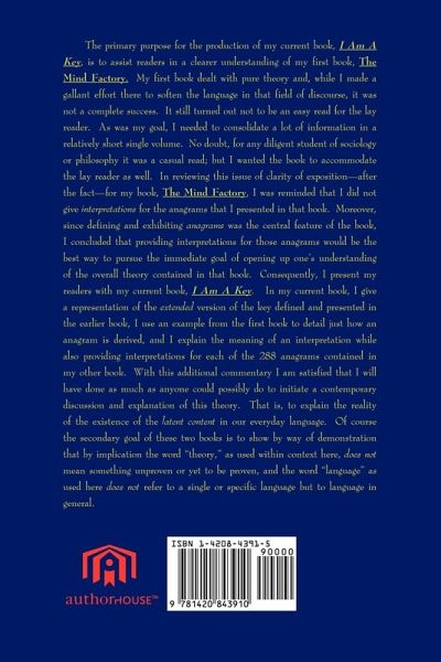 The primary purpose for the production of my current book, I Am A Key, is to assist readers in a clearer understanding of my first book, The Mind Factory. My first book dealt with pure theory and, while I made a gallant effort there to soften the language in that field of discourse, it was not a complete success. It still turned out not to be an easy read for the lay reader. As was my goal, I needed to consolidate a lot of information in a relatively short single volume. No doubt, for any diligent student of sociology or philosophy it was a casual read; but I wanted the book to accommodate the lay reader as well. In reviewing this issue of clarity of exposition-after the fact-for my book, The Mind Factory, I was reminded that I did not give interpretations for the anagrams that I presented in that book. Moreover, since defining and exhibiting anagrams was the central feature of the book, I concluded that providing interpretations for those anagrams would be the best way to pursue the immediate goal of opening up one's understanding of the overall theory contained in that book. Consequently, I present my readers with my current book, I Am A Key. In my current book, I give a representation of the extended version of the key defined and presented in the earlier book, I use an example from the first book to detail just how an anagram is derived, and I explain the meaning of an interpretation while also providing interpretations for each of the 288 anagrams contained in my other book. With this additional commentary I am satisfied that I will have done as much as anyone could possibly do to initiate a contemporary discussion and explanation of this theory. That is, to explain the reality of the existence of the latent content in our everyday language. Of course the secondary goal of these two books is to show by way of demonstrate that by implication the word "theory," as used within context here, does not mean something unproven or yet to be proven, and the