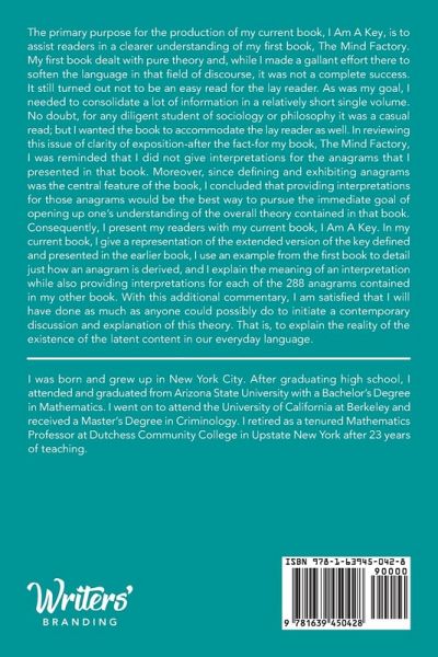 The primary purpose for the production of my current book, I Am A Key, is to assist readers in a clearer understanding of my first book, The Mind Factory. My first book dealt with pure theory and, while I made a gallant effort there to soften the language in that field of discourse, it was not a complete success. It still turned out not to be an easy read for the lay reader. As was my goal, I needed to consolidate a lot of information in a relatively short single volume. No doubt, for any diligent student of sociology or philosophy, it was a casual read; but I wanted the book to accommodate the lay reader as well. In reviewing this issue of clarity of exposition-after the fact-for my book, The Mind Factory, I was reminded that I did not give interpretations for the anagrams that I presented in that book. Moreover, since defining and exhibiting anagrams was the central feature of the book, I concluded that providing interpretations for those anagrams would be the best way to pursue the immediate goal of opening up one's understanding of the overall theory contained in that book. Consequently, I present my readers with my current book, I Am A Key. In my current book, I give a representation of the extended version of the key defined and presented in the earlier book, I use an example from the first book to detail just how an anagram is derived, and I explain the meaning of an interpretation while also providing interpretations for each of the 288 anagrams contained in my other book. With this additional commentary, I am satisfied that I will have done as much as anyone could possibly do to initiate a contemporary discussion and explanation of this theory. That is, to explain the reality of the existence of the latent content in our everyday language.