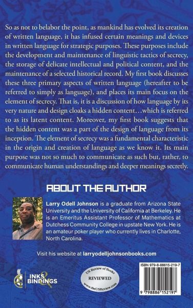 So as not to belabor the point, as mankind has evolved its creation of written language, it has infused certain meanings and devices in written language for strategic purposes. These purposes include the development and maintenance of linguistic tactics of secrecy, the storage of delicate intellectual and political content, and the maintenance of a selected historical record. My first book discusses these three primary aspects of written language (hereafter to be referred to simply as language), and places its main focus on the element of secrecy. That is, it is a discussion of how language by its very nature and design cloaks a hidden content...which is referred to as its latent content. Moreover, my first book suggests that the hidden content was a part of the design of language from its inception. The element of secrecy was a fundamental characteristic in the origin and creation of language as we know it. Its main purpose was not so much to communicate as such but, rather, to communicate human understandings and deeper meanings secretly.