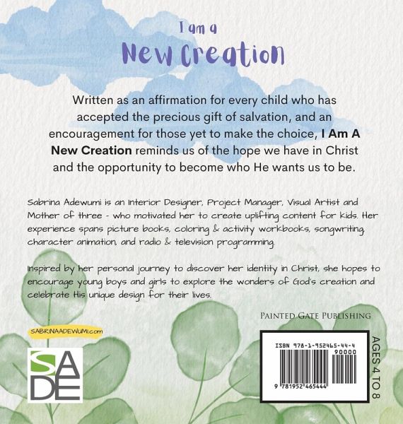 The Word of God is a source of affirmation and encouragement, particularly for young children still discovering who they are. Verses such as 2 CORINTHIANS 5:17 - "Anyone who belongs to Christ is a new person. The past is forgotten, and everything is new," remind us that our past does not determine our future, because God has promised us new life in Him through Jesus Christ. Written as an affirmation for every child who has accepted the precious gift of salvation, and an encouragement for those yet to make the choice, I Am A New Creation reminds us of the hope we have in Christ and the opportunity to become who He wants us to be. "In Christ, we are a new creation. In Him, all things are made new!" As part of an introductory collection by the author, I Am a New Creation is filled with declarations inspired by and pulled directly from passages in the Bible. Whether read aloud with a parent, memorized as simple poetry or translated into song, these declarations will be enjoyed over and over again, helping children to understand and appreciate God's design. Simple language combined with rich vocabulary supports the needs of emerging readers, while carefully-selected imagery, diverse portraits and graphics in a hand-drawn style, provide a relatable reference for young children of any background. ABOUT THE AUTHOR Sabrina Adewumi is an Interior Designer, Project Manager, Visual Artist and Mother of three - who motivated her to create uplifting content for kids. Her experience spans picture books, coloring & activity workbooks, songwriting, character animation, and radio & television programming. Inspired by her personal journey to discover her identity in Christ, she hopes to encourage young boys and girls to explore the wonders of God's creation and celebrate His unique design for their lives.