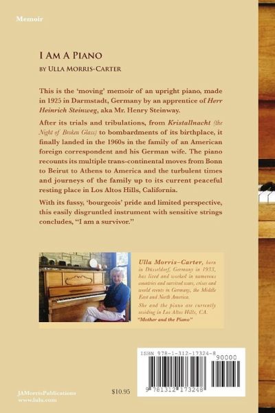 This is the 'moving' memoir of an upright piano, made in 1925 in Darmstadt, Germany by an apprentice of Herr Heinrich Steinweg, aka Mr. Henry Steinway. After its trials and tribulations, from Kristallnacht (the night of broken glass) to bombardments of its birthplace, it finally landed in the 1960s in the family of an American foreign correspondent and his German wife. The piano recounts its multiple trans-continental moves from Bonn to Beirut to Athens to America and the turbulent times and journeys of the family up to its current peaceful resting place in Los Altos Hills, California. With its fussy, 'bourgeois' pride and limited perspective, this easily disgruntled instrument with sensitive strings concludes, "I am a survivor." 6x9 PerfectBound, Cream Pages