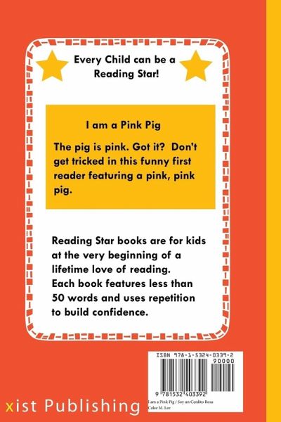 Every Child Can be a Reading Star in this Bilingual English/Spanish Book The pig is pink. Got it? Don't get tricked in this funny beginning reader featuring a pink, pink pig. I am a Pink Pig is the first book in the Reading Stars series. Reading Star books are for kids at the very beginning of a lifetime love of reading. Each book features less than 50 words and uses repetition to build confidence. I am a Pink Pig is 20 pages long and features 13 different words for your child to master. The words are : I, a, am, not, red, pink, blue, green, pig, cat, dog, bird, turtle. Cada niño puede ser una estrella de lectura en este libro bilingüe inglés / español El cerdo es rosado. ¿Entender? No consiga engañado en este lector divertido del comienzo que ofrece un cerdo rosado, rosado. Soy un cerdo rosado es el primer libro en la serie de las estrellas de la lectura. Los libros de la lectura de la estrella son para los cabritos en el principio de un amor de la vida de la lectura. Cada libro cuenta con menos de 50 palabras y utiliza la repetición para crear confianza. Yo soy un cerdo rosa es de 20 páginas de largo y cuenta con 13 palabras diferentes para su hijo a dominar. Las palabras son: I, a, soy, no, rojo, rosa, azul, verde, cerdo, gato, perro, pájaro, tortuga.