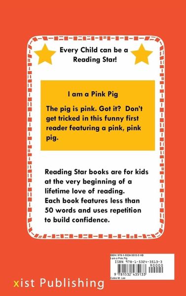 Every Child Can be a Reading Star The pig is pink. Got it? Don't get tricked in this funny beginning reader featuring a pink, pink pig. I am a Pink Pig is the first book in the Reading Stars series. Reading Star books are for kids at the very beginning of a lifetime love of reading. Each book features less than 50 words and uses repetition to build confidence. I am a Pink Pig is 20 pages long and features 13 different words for your child to master. The words are : I, a, am, not, red, pink, blue, green, pig, cat, dog, bird, turtle.