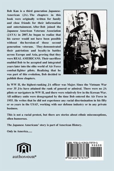 Bob Kan is a third generation Japanese-American (JA). The chapters in this book were originally written for family and close friends for their information and entertainment. After Bob joined the Japanese American Veterans Association (JAVA) in 2007, he began to realize that his career would not have been possible without the heroism of those second generation veterans. They demonstrated their patriotism and loyalty in battles across Europe and Asia, proving that they were REAL AMERICANS. Their sacrifices enabled Bob to be accepted and integrated years later into the elite world of Air Force combat fighter pilots. Realizing that he was part of this evolution, Bob decided to publish these chapters. In WW II, the highest-ranking JA officer was Major. Since the Vietnam War over 35 JAs have attained the rank of general or admiral. There were no JA pilots or navigators in WW II, and there were relatively few in the Korean War. All military units were desegregated by the time Bob entered the Air Force in 1955. He writes that he did not experience any racial discrimination in his fifty or so years in the USAF, working with our defense industry or in any private business. This is not a racial protest, but there are stories about ethnic misconceptions, often humorous. The Japanese Americans' story is part of American History. Only in America......