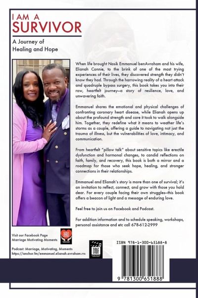 I AM A Survivor is an inspiring memoir that chronicles the life of Nasik Emmanuel Shahid benAvraham, a man who rose above extraordinary hardships to transform his life and inspire countless others. This powerful narrative captures his journey from a youth marked by homelessness and adversity to a life of purpose, resilience, and leadership. Growing up in Newark, New Jersey, Emmanuel faced unimaginable challenges, including homelessness at the age of 15 due to his family's struggles with addiction and criminal activity. Despite these hardships, he persevered, navigating life on the streets while still pursuing an education. His story paints a vivid picture of determination in the face of overwhelming odds and the unyielding pursuit of a better future. A vital part of Emmanuel's success is the support and partnership of his wife, Elianah Connie. Elianah's unwavering love, strength, and wisdom have been instrumental in their shared mission to uplift others. Together, they exemplify the power of unity and mutual support, using their experiences to inspire at-risk youth and adults to take responsibility for their thoughts and actions. Elianah's role as a mentor and advocate further enriches the story, making their journey a shared testament to the strength of resilience and community. Through heartfelt storytelling, I AM A Survivor reveals the transformative power of self-discipline, education, and hope. It explores how Emmanuel and Elianah turned their struggles into a mission to empower others, teaching critical life skills and fostering a mindset of accountability and self-reliance. Their journey serves as a blueprint for overcoming adversity and achieving personal and collective growth. What makes I AM A Survivor unique is its universal appeal and practical wisdom. It is more than a memoir-it is a guide for anyone seeking to overcome challenges and live a life of purpose. Whether you are facing personal struggles, mentoring others, or striving to create change in your community, this book provides the tools, insights, and inspiration to persevere. Ultimately, I AM A Survivor is a story of hope, resilience, and the boundless potential of the human spirit. Nasik Emmanuel Shahid Avraham and Elianah Connie's journey demonstrates that no matter the challenges, it is possible to rise above them, thrive, and inspire others to do the same. This book will leave readers empowered to embrace their strength, transform their lives, and impact their communities.