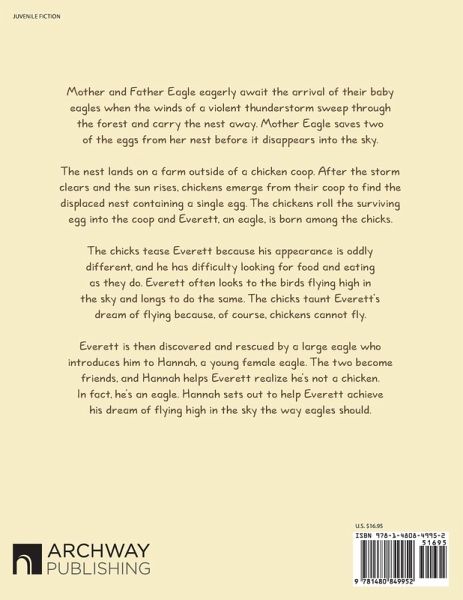 Mother and Father Eagle eagerly await the arrival of their baby eagles when the winds of a violent thunderstorm sweep through the forest and carry the nest away. Mother Eagle saves two of the eggs from her nest before it disappears into the sky. The nest lands on a farm outside of a chicken coop. After the storm clears and the sun rises, chickens emerge from their coop to find the displaced nest containing a single egg. The chickens roll the surviving egg into the coop and Everett, an eagle, is born among the chicks. The chicks tease Everett because his appearance is oddly different, and he has difficulty looking for food and eating as they do. Everett often looks to the birds flying high in the sky and longs to do the same. The chicks taunt Everett's dream of flying because, of course, chickens cannot fly. Everett is then discovered and rescued by a large eagle who introduces him to Hannah, a young female eagle. The two become friends, and Hannah helps Everett realize he's not a chicken. In fact, he's an eagle. Hannah sets out to help Everett achieve his dream of flying high in the sky the way eagles should.