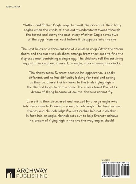 Mother and Father Eagle eagerly await the arrival of their baby eagles when the winds of a violent thunderstorm sweep through the forest and carry the nest away. Mother Eagle saves two of the eggs from her nest before it disappears into the sky. The nest lands on a farm outside of a chicken coop. After the storm clears and the sun rises, chickens emerge from their coop to find the displaced nest containing a single egg. The chickens roll the surviving egg into the coop and Everett, an eagle, is born among the chicks. The chicks tease Everett because his appearance is oddly different, and he has difficulty looking for food and eating as they do. Everett often looks to the birds flying high in the sky and longs to do the same. The chicks taunt Everett's dream of flying because, of course, chickens cannot fly. Everett is then discovered and rescued by a large eagle who introduces him to Hannah, a young female eagle. The two become friends, and Hannah helps Everett realize he's not a chicken. In fact, he's an eagle. Hannah sets out to help Everett achieve his dream of flying high in the sky the way eagles should.