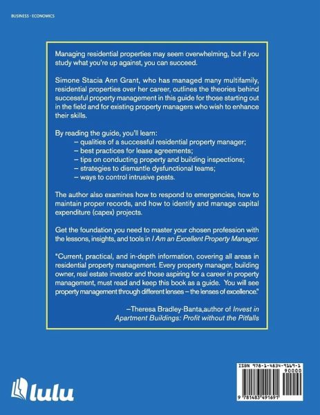 Managing residential properties may seem overwhelming, but if you study what you're up against, you can succeed. Simone Stacia Ann Grant, who has managed many multifamily, residential properties over her career, outlines the theories behind successful property management in this guide for those starting out in the field and for existing property managers who wish to enhance their skills. By reading the guide, you'll learn: - qualities of a successful residential property manager; - best practices for lease agreements; - tips on conducting property and building inspections; - strategies to dismantle dysfunctional teams; - ways to control intrusive pests. The author also examines how to respond to emergencies, how to maintain proper records, and how to identify and manage capital expenditure (capex) projects. Get the foundation you need to master your chosen profession with the lessons, insights, and tools in I Am an Excellent Property Manager.