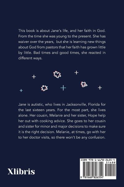 This book is about Jane's life, and her faith in God. From the time she was young to the present. She has waiver over the years, but she is learning new things about God from pastors that her faith has grown little by little. Bad times and good times, she reacted in different ways.