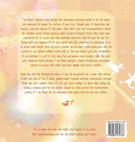 Dive into "I am Being," a transformative guide by Linda Suliman, where each page turns the key to a world of sustained health and happiness. This book isn't just a read; it's a revelation of 25 intuitive habits that align closely with our biological essence, intricately woven into the fabric of daily life. Each habit, simple yet profound, paves the way for families to thrive in harmony with nature's rhythm. In today's fast-paced world, children and parents face a multitude of challenges. "I am Being" offers more than just solutions; it empowers families to become their own health champions. Linda Suliman, with her extensive background in Ayurveda, Nutrition, and German New Medicine, reveals secrets that go beyond conventional wellness practices. These are not mere recommendations; they are time-tested practices, seamlessly integrated into a lifestyle that resonates with authenticity and well-being. Designed for parents and children alike, this book is a call to action. It invites readers to not just understand but to feel, sense, and live each moment more fully. Through Linda's expert guidance, each habit unfolds page by page, offering a chance to rediscover what it means to be truly healthy and happy. With "I am Being," embark on a journey that transcends mere physical health, tapping into deeper, more intuitive senses. It's a path that promises to strengthen family bonds, foster deep conversations, and set a luminous path for our children's future.