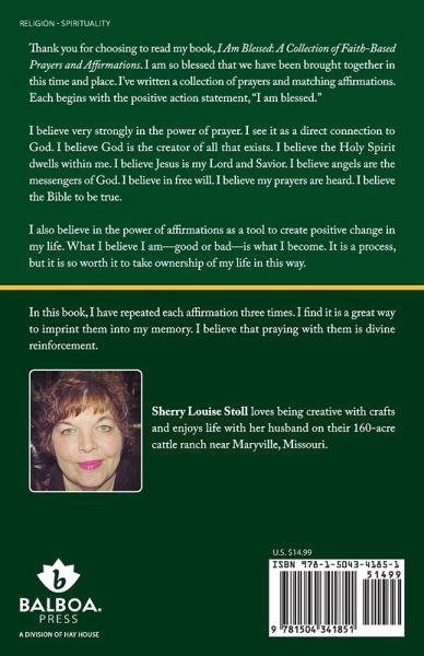 Thank you for choosing to read my book, I Am Blessed: A Collection of Faith-Based Prayers and Affirmations. I am so blessed that we have been brought together in this time and place. I've written a collection of prayers and matching affirmations. Each begins with the positive action statement, "I am blessed." I believe very strongly in the power of prayer. I see it as a direct connection to God. I believe God is the creator of all that exists. I believe the Holy Spirit dwells within me. I believe Jesus is my Lord and Savior. I believe angels are the messengers of God. I believe in free will. I…mehr