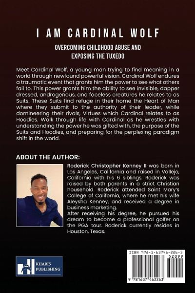 Meet Cardinal Wolf, a young man trying to find meaning in a world through newfound powerful vision. Cardinal Wolf endures a traumatic event that grants him the power to see what others fail to. This power grants him the ability to see invisible, dapper dressed, androgenous, and faceless creatures he relates to as Suits. These Suits find refuge in their home the Heart of Man where they submit to the authority of their leader, while domineering their rivals, Virtues which Cardinal relates to as Hoodies. Walk through life with Cardinal as he wrestles with understanding the power he was gifted with, the purpose of the Suits and Hoodies, and preparing for the perplexing paradigm shift in the world. Endorsement:I Am Cardinal Wolf by Roderick Kenney II is a must-read for anyone seeking a candid and intimate portrayal of the struggles and challenges that come with life after sexual abuse. Kenney's raw, authentic and deeply moving storytelling takes the reader on a journey of pain, triumph and self-acceptance that is truly remarkable. The cardinal wolf serves as a poignant metaphor for the author's own journey toward recovery, adding depth and complexity to the story. Kenney's courageous and honest storytelling is a true testament to the strength of the human spirit and the transformative power of literature. ¿Chad Herold, Pastor at Richmond Point Church Missouri City, Tx About the Author: Roderick Christopher Kenney II was born in Los Angeles, California and raised in Vallejo, California with his 6 siblings. Roderick was raised by both parents in a strict Christian household. Roderick attended Saint Mary's College of California, where he met his wife Aleysha Kenney, and received a degree in business marketing. After receiving his degree, he pursued his dream to become a professional golfer on the PGA tour. Roderick currently resides in Houston, Texas.
