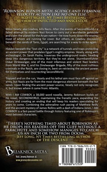 Milos Vesely, aka Cowboy, kills Nazis. After the events of SecondWorld-a failed attempt by modern Nazi forces to carry out a worldwide genocide and claim the planet for the Aryan nation-he now hunts down the enemy, most of whom are running for cover. But others, as Cowboy discovers beneath the sands of Tanis, Egypt, are searching for a way to strike again. Hidden beneath the "lost city" is a network of tunnels and traps protecting an ancient power that predates Egypt's mighty empires. Vesely, along with archeologist, Dr. Sarah Pasha, traverses the underground realm, heading deep into dangerous territory. But they're not alone. Sturmbannführer Oskar Dirlewanger, one of the most infamous and violent Nazi leaders from World War II, and his Direlwanger Brigade, fifty of the most ruthless criminals in the Reich, are closing in, bent on retrieving the ancient power for themselves and resurrecting SecondWorld. Trapped and on the run, Vesely and his lethal aim must face off against an army, but Nazis are far from the most dangerous element beneath the hot sands. Upon finding the ancient power source, Vesely not only recognizes it, but knows where it came from: Atlantis. With I AM COWBOY, a 38,000 word novella, Jeremy Robinson builds on his novel, SECONDWORLD, maintaining the frenetic pace, expanding the history and creating an ending that will keep his readers speculating for years to come. Combining the adrenaline rush pacing of Matthew Reilly and the ancient mystery of James Rollins with a dash of Indiana Jones, I AM COWBOY is a fast-paced battle through history featuring one of Robinson's most beloved characters.