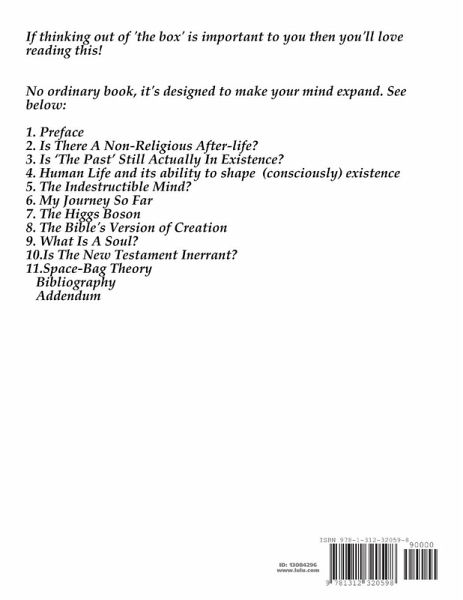 If thinking out of 'the box' is important to you then you'll love reading this! No ordinary book, it's designed to make your mind expand. See below: 1. Preface 2. Is There A Non-Religious After-life? 3. Is 'The Past' Still Actually In Existence? 4. Human Life and its ability to shape (consciously) existence. 5. The Indestructible Mind? 6. My Journey So Far 7. The Higgs Boson 8. The Bible's Version of Creation 9. What Is A Soul? 10.Is The New Testament Inerrant? 11.Space-Bag Theory Bibliography Addendum