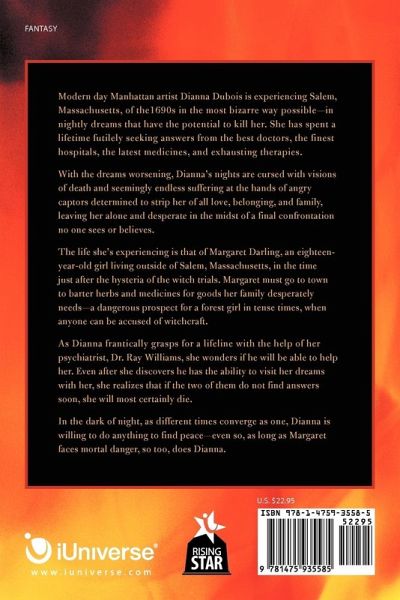 Modern day Manhattan artist Dianna Dubois is experiencing Salem, Massachusetts, of the1690s in the most bizarre way possible-in nightly dreams that have the potential to kill her. She has spent a lifetime futilely seeking answers from the best doctors, the finest hospitals, the latest medicines, and exhausting therapies. With the dreams worsening, Dianna's nights are cursed with visions of death and seemingly endless suffering at the hands of angry captors determined to strip her of all love, belonging, and family, leaving her alone and desperate in the midst of a final confrontation no one sees or believes. The life she's experiencing is that of Margaret Darling, an eighteen-year-old girl living outside of Salem, Massachusetts, in the time just after the hysteria of the witch trials. Margaret must go to town to barter herbs and medicines for goods her family desperately needs-a dangerous prospect for a forest girl in tense times, when anyone can be accused of witchcraft. As Dianna frantically grasps for a lifeline with the help of her psychiatrist, Dr. Ray Williams, she wonders if he will be able to help her. Even after she discovers he has the ability to visit her dreams with her, she realizes that if the two of them do not find answers soon, she will most certainly die. In the dark of night, as different times converge as one, Dianna is willing to do anything to find peace-even so, as long as Margaret faces mortal danger, so too, does Dianna.