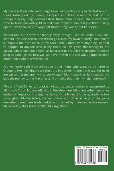 The Endermen are in town to build Dynamite's Creeper Neighborhood a wall to protect their community from intrusion from other mobs. But can the Endermen be trusted to do the job or are they out to do something bad to the Creepers? My name is Dynamite, and things have been pretty crazy in the last month. I was kidnapped by miners, escaped, and then saved the rest of the Creepers in my neighborhood from those same miners. The miners then tried to bribe me with gold to make me forgive them and join their mining operation! There was no way that those things was about to happen! I'm not about to throw the money away, though. That would be ridiculous. Instead, I've decided to invest that gold into my town's safety. The miners kidnapped me from close to my own home. I don't want anything like that to happen to anyone else in my town. So I've given the money to the Mayor. She's said she'll help to build a wall around the neighborhood to keep us safe. I guess now we just have to wait and see what happens when Endermen build this wall for us! Are we really safe from miners or other mobs who want to do harm to Creepers like me? Should we trust the Endermen to build the wall for us or are we letting the enemy into our village? Did I made the right decision to give the money to the Mayor or am I bringing doom to my neighborhood? An Unofficial Minecraft Diary Book for Kids Ages 9 - 12 (Preteen / Thrilling Minecraft Adventure / Minecraft Novel THIS MINECRAFT ADVENTURE STORY IS A MUST READ FOR MINECRAFT FANS ESPECIALLY FOR KIDS AGE 5-7 , 6-8 , 8-10 , 9-12 , THIS EXCITING MINECRAFT BOOKS IS MADE for ages 6, 7, 8, 9, 10, 11, 12 and older. MOTIVATE YOUR 8 YEAR OLD BOYS AND GIRLS OR MINECRAFT KIDS AGES 9-12 TO READ WITH THIS EXCITING STORY. GET YOUR COPY NOW!!! This unofficial Minecraft book is not authorized, endorsed or sponsored by Microsoft Corp., Mojang AB, Notch Development AB or any other person or entity owning or controlling the rights of the Minecraft name, trademark or copyrights. All characters, names, places and other aspects of the game described herein are trademarked and owned by their respective owners. Minecraft®/ /TM & (c)2009-2016 Mojang/Notch.