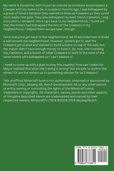 After being kidnapped by miners, now he's being forced to work in the mines of the same miners who kidnapped him in the past. My name is Dynamite, and I'm just as unlucky as someone would expect a Creeper with my name to be. A couple of months ago, I was kidnapped by a group of miners because they wanted to blow up Creepers so they could more easily find gold. They also kidnapped my best friend, Cameron. Long story short, I escaped. Once I got back to my neighborhood, I found out that the miners had kidnapped the rest of the Creepers in my neighborhood. I helped them escape later, though. Once everyone got back to the neighborhood, we hired Endermen to build a wall around the neighborhood. However, spiders got in, and the Creepers got scared and wanted to build a dome on top of the wall, but the mayor didn't have enough money to fund it. So, now, she's sending me, Cameron, and a bunch of other Creepers to work in the mine of the same miners who kidnapped us! I can't believe it! I need to come up with a plan to stop this insanity! How can I make the Mayor realized that what she's doing is wrong? Are we safe to work in the mines? Or are the miners up to something sinister for us Creepers? An Unofficial Minecraft Diary Book for Kids Ages 9 - 12 (Preteen / Thrilling Minecraft Adventure / Minecraft Novel THIS MINECRAFT ADVENTURE STORY IS A MUST READ FOR MINECRAFT FANS ESPECIALLY FOR KIDS AGE 5-7 , 6-8 , 8-10 , 9-12 , THIS EXCITING MINECRAFT BOOKS IS MADE for ages 6, 7, 8, 9, 10, 11, 12 and older. MOTIVATE YOUR 8 YEAR OLD BOYS AND GIRLS OR MINECRAFT KIDS AGES 9-12 TO READ WITH THIS EXCITING STORY. GET YOUR COPY NOW!!! This unofficial Minecraft book is not authorized, endorsed or sponsored by Microsoft Corp., Mojang AB, Notch Development AB or any other person or entity owning or controlling the rights of the Minecraft name, trademark or copyrights. All characters, names, places and other aspects of the game described herein are trademarked and owned by their respective owners. Minecraft®/ /TM & (c)2009-2016 Mojang/Notch.
