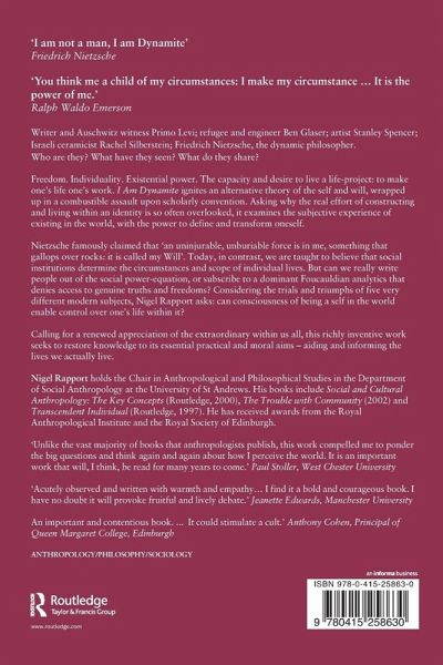 Power is conventionally regarded as being held by social institutions. We are taught to believe that it is these social structures that determine the environment and circumstances of individual lives. In I Am Dynamite, the anthropologist Nigel Rappaport argues for a different view. Focusing on the lives and works of the writer and Auschwitz survivor Primo Levi, refugee and engineer Ben Glaser, Israeli ceramicist and immigrant Rachel Siblerstein, artist Stanley Spencer, and philosopher Friedrich Nietzsche, he shows how we can have the capacity and inclination to formulate 'life projects'. It is in the pursuit of these life projects, that is, making our life our work, that we can avoid the structures of ideology and institution.