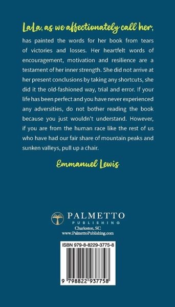 Lala, as we affectionately call her, has painted the words for her book from tears of victories and losses. Her heartfelt words of encouragement, motivation and resilience are a testament of her inner strength. She did not arrive at her present conclusions by taking any shortcuts, she did it the old-fashioned way, trial and error. If your life has been perfect and you have never experienced any adversities, do not bother reading the book because you just wouldn't understand. However, if you are from the human race like the rest of us who have had our fair share of mountain peaks and sunken valleys, pull up a chair. -Emmanuel Lewis