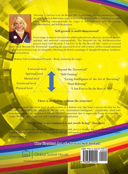 Dr. Rimaletta Ray with her Educational Say! The book "I am Free to be the Best of Me!" is presenting the self-creation process in the initial physical dimension, as presented in the Holistic Self-Actualization pyramid below, featuring consequentially the stages of Self-Awareness, Self-Monitoring, Self-Installation, and Self-Realization. Self-growth is multi-dimensional! Every stage, in turn, is viewed in five philosophical levels: physical, emotional, mental, spiritual, and universal consequentially. The blueprint for the Self-Resurrection process starts with the book "I Am Free to be the Best…mehr
