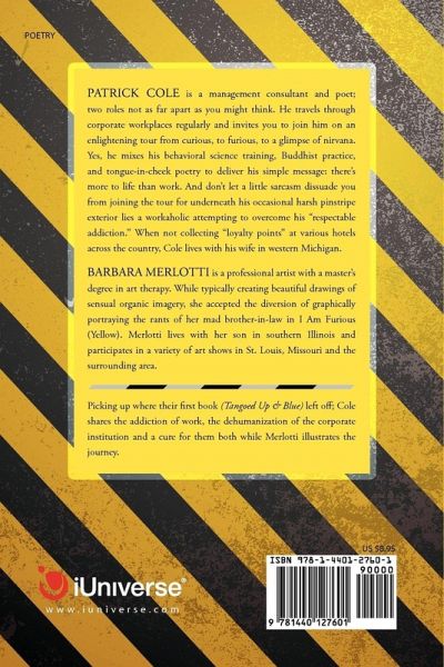 Patrick Cole is a management consultant and poet; two roles not as far apart as you might think. He travels through corporate workplaces regularly and invites you to join him on an enlightening tour from curious, to furious, to a glimpse of nirvana. Yes, he mixes his behavioral science training, Buddhist practice, and tongue-in-cheek poetry to deliver his simple message: there's more to life than work. And don't let a little sarcasm dissuade you from joining the tour for underneath his occasional harsh pinstripe exterior lies a workaholic attempting to overcome his "respectable addiction." When not collecting "loyalty points" at various hotels across the country, Cole lives with his wife in western Michigan. Barbara Merlotti is a professional artist with a master's degree in art therapy. While typically creating beautiful drawings of sensual organic imagery, she accepted the diversion of graphically portraying the rants of her mad brother-in-law in I Am Furious (Yellow). Merlotti lives with her son in southern Illinois and participates in a variety of art shows in St. Louis, Missouri and the surrounding area. Picking up where their first book (Tangoed Up & Blue) left off; Cole shares the addiction of work, the dehumanization of the corporate institution and a cure for them both while Merlotti illustrates the journey.