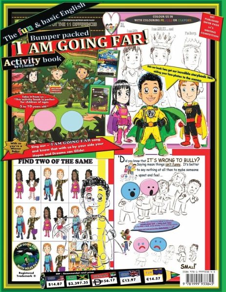 The I AM GOING FAR! fun-packed activity book is a perfect gift for boys and girls age 5 to 10. Children will be engaged in colouring-in the amazing illustrations, reading, singing-along, following the positive role model character Miles PR and his close friends Meg and Harry, on fantastic adventures to become the best person they can be. Kids will be invited to add their cute face photos to colourful storybook scenes. They can add any good deeds or claims to fame that they may have done or been granted. This richly coloured matte covered velvety feel book is great to touch and is a great morale booster to kids. They can complete missing word puzzles, spot the difference, even enter an incredible writing competition and more...